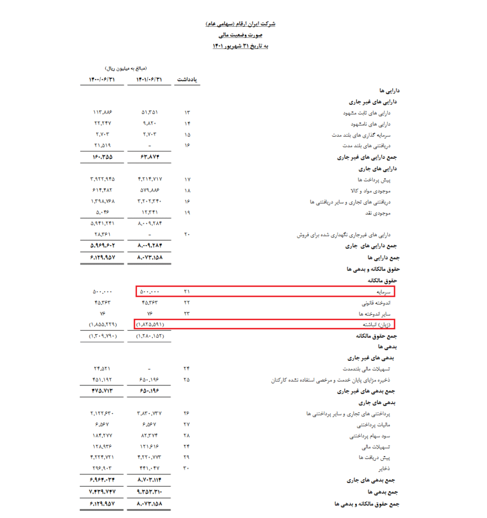 برای مثال، در تصویر زیر ترازنامه شرکت ایران ارقام (نماد مرقام) نمایش داده شده است که زیان انباشته آن بیش از سه برابر سرمایه ثبتشده است؛ این یعنی شرکت بهطور کامل مشمول ماده ۱۴۱ قانون تجارت است و نیازمند تصمیمهای جدی مدیریتی برای خروج از این وضعیت خواهد بود.
