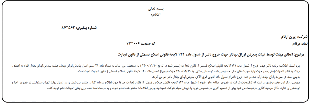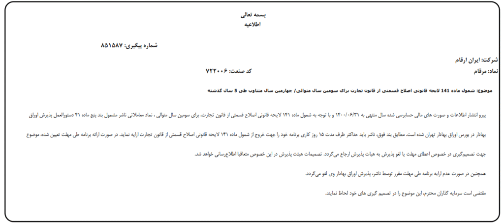پس از انتشار اطلاعیه برنامه ناشر جهت خروج از شمول ماده 141، هیئت پذیرش اوراق بهادار مهلتی را جهت خروج شرکت از ماده 141 را تعیین میکند و طی اطلاعیهای تحت عنوان اعطای مهلت توسط هیئت پذیرش اوراق بهادار جهت خروج ناشر از شمول ماده 141 را در سایت کدال منتشر میکند که نمونهی آن را در تصویر زیر مشاهده میکنیم.