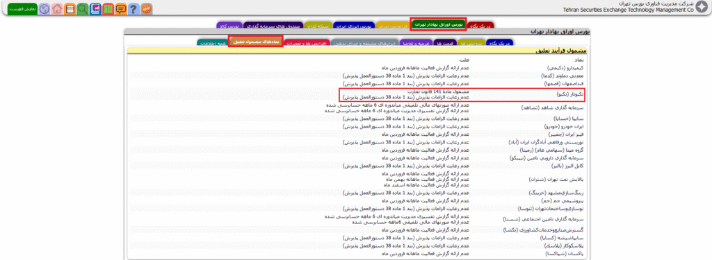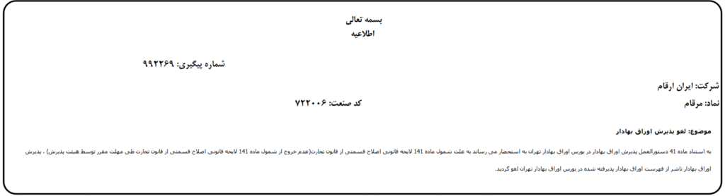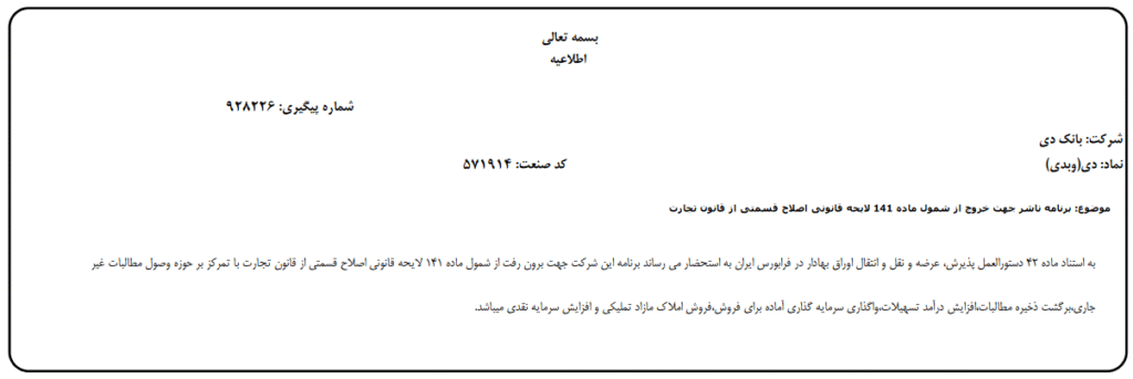 در تصویر زیر نیز اطلاعیه برنامه ناشر جهت خروج از شمول ماده 141 را برای نماد بانک دی مشاهده میکنیم.