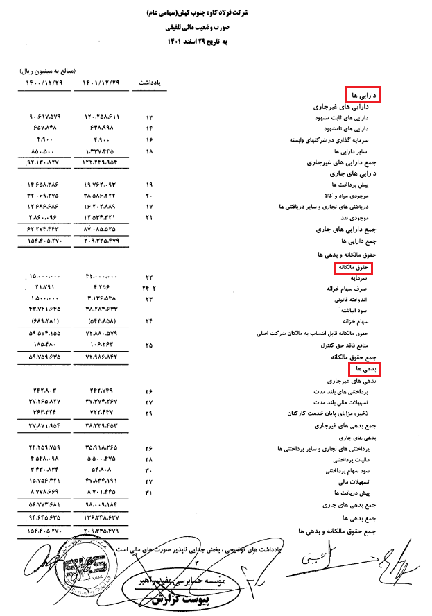 در تصویر زیر ترازنامه شرکت کاوه منتهی به 29 اسفند 1401 را مشاهده می‌کنیم.