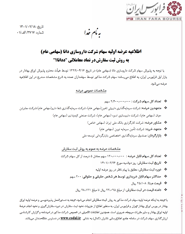 در تصویر بالا اطلاعیه عرضه اولیه نماد شرکت داروسازی دانا با نماد “ددانا” را مشاهده میکنید.