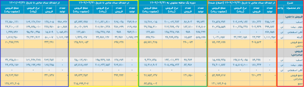 در بخش مشخص‌شده با رنگ قرمز در گزارش فعالیت ماهانه شرکت، فهرست محصولات اصلی فخوز—یعنی اسلب، بلوم، بیلت، آهن اسفنجی و گندله—به همراه مقدار تولید هرکدام (برحسب تن) درج شده است. در ناحیه سبز رنگ نیز اطلاعات مربوط به عملکرد ماه گذشته درج می‌شود. برای نمونه، در گزارش خرداد ۱۴۰۲، شرکت فولاد خوزستان ۹۹٬۷۴۲ تن اسلب تولید کرده که از این مقدار ۸۶٬۸۰۳ تن در بازار داخلی و ۴۸٬۲۷۴ تن در بازار صادراتی به فروش رسیده است. ممکن است در برخی موارد جمع میزان فروش از مقدار تولید بیشتر باشد؛ دلیل این موضوع فروش بخشی از موجودی انبار ماه‌های قبل است که در گزارش لحاظ می‌شود.