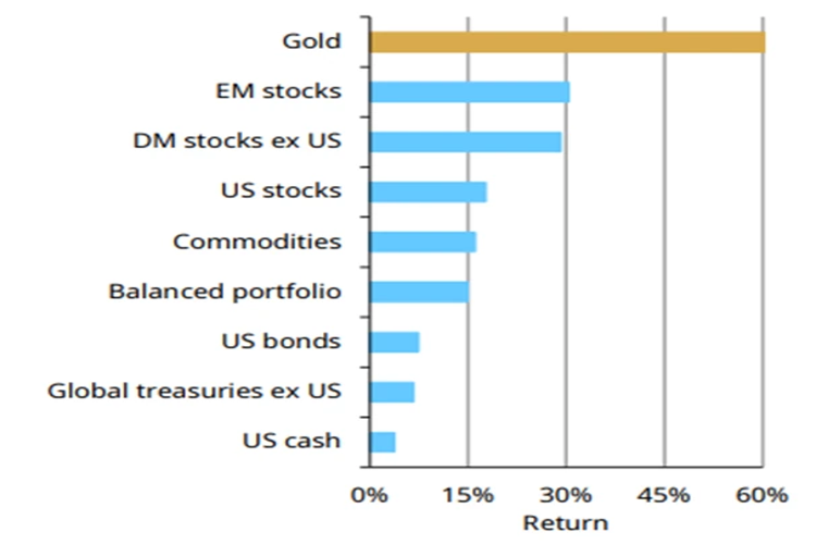 این نمودار به وضوح نشان میدهد که این فلز گرانبها نه تنها از تمامی کلاسهای دارایی اصلی سبقت گرفته، بلکه با فاصلهای چشمگیر در صدر قرار دارد.
