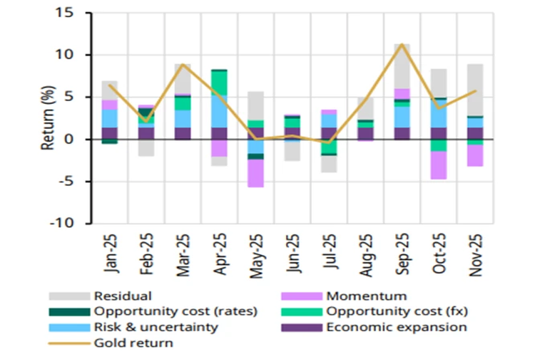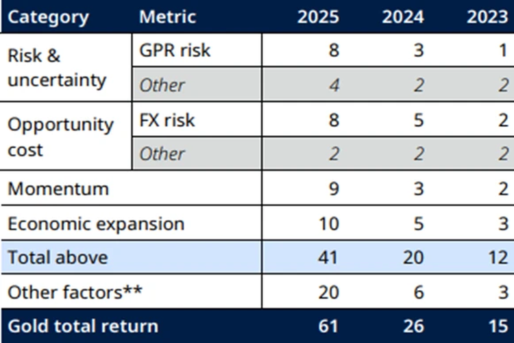 در مجموع، کاهش هزینه فرصت حدود ۱۰ واحد درصد به بازده افزود. اثر ترکیبی ضعف دلار و ریسک ژئوپلیتیک حتی قابلتوجهتر بوده و حدود 16 واحد درصد از عملکرد سالانه را توضیح میدهد.