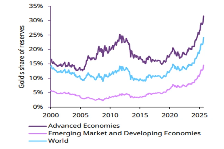 همانطور که نمودار نشان میدهد، سهم طلا در ذخایر ارزی اقتصادهای نوظهور بهطور تاریخی کمتر از اقتصادهای پیشرفته بوده است. این فضای گسترده برای افزایش بیشتر خریدها وجود دارد، بهویژه اگر تنشهای ژئوپلیتیکی تشدید شود.