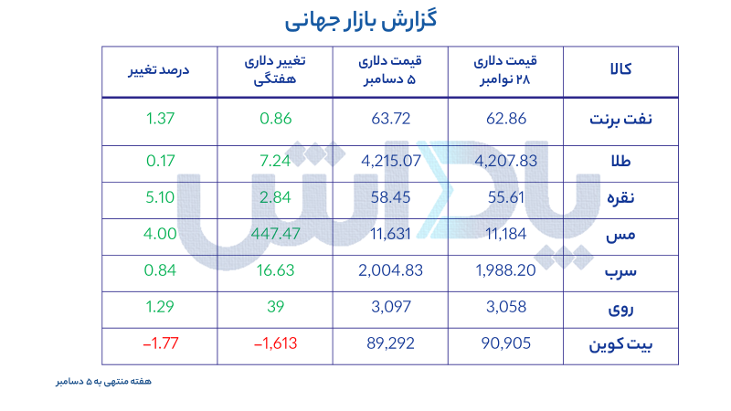 قیمت نفت برنت از ۶۲.۸۶ دلار در ۲۸ نوامبر به ۶۳.۷۲۲ دلار در ۵ دسامبر رسید و در این هفته بیشتر از سمت عرضه هدایت شد. نگرانیهای ژئوپلیتیک، اختلالهای محدود در حملونقل و همچنین سیگنالهایی مبنی بر کاهش احتمالی تولید در برخی کشورها، فضای حمایتی برای بازار نفت ایجاد کرد.