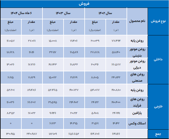 در بازار داخلی نیز روغن پایه همچنان محصول استراتژیک شرکت بهشمار میآید؛ بهطوریکه حدود ۲۹ درصد از فروش داخلی مربوط به روغن پایه است و این رقم معادل بیش از ۱۲ درصد از کل فروش شرکت میباشد. به بیان دیگر، تنها فروش داخلی روغن پایه، خودش یک سهم معنادار از کل درآمد شرکت را تشکیل میدهد و این موضوع اهمیت این محصول را در هر دو حوزه داخلی و صادراتی دوچندان میکند.
