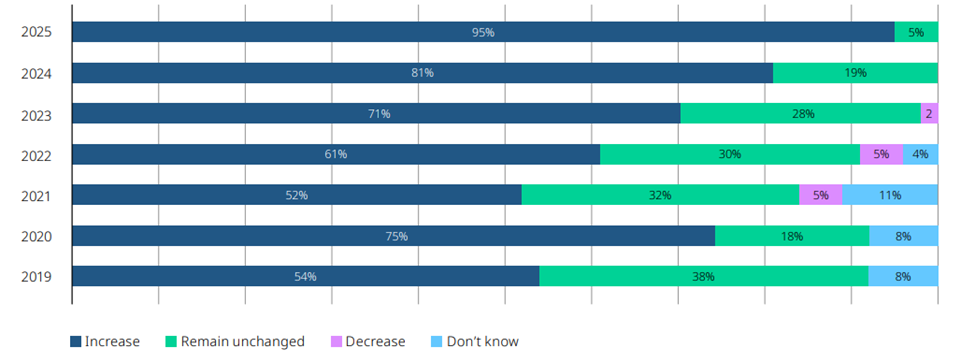 ۴۳ درصد پاسخدهندگان نظرسنجی درباره چشمانداز طلای بانکهای مرکزی انتظار دارند ذخایر طلای کشورشان افزایش یابد. اما باز هم تفاوت میان دو گروه آشکار است. اقتصادهای پیشرفته معمولاً سطح ذخایر طلای بالایی دارند و انگیزه کمی برای افزایش سریع دارند. اما نوظهورها همچنان بهطور فعال خریدارند.