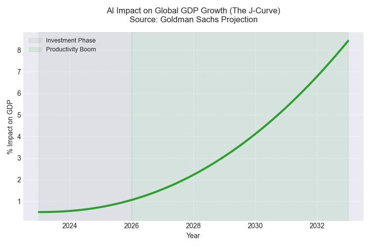 نمودار 3 – پیش بینی اثر هوش مصنوعی بر تولید ناخالص جهانی بر اساس منحنی J