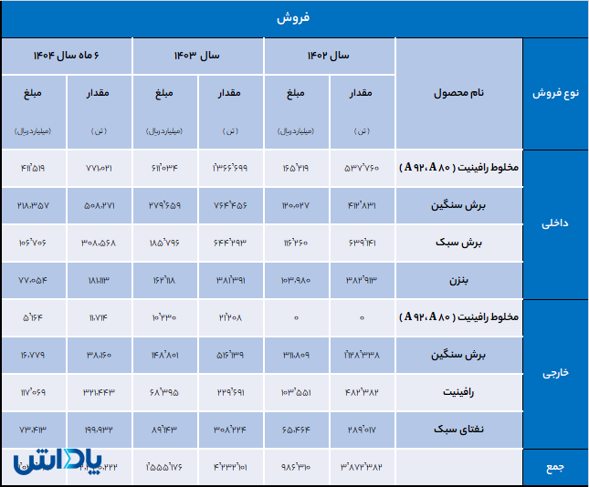 نوری در گزارش ماهانه مهرماه به فروش ۱۲۹,۵۷۲ میلیارد ریال دست یافته که نشاندهنده کاهش ۴۰ درصدی نسبت به ماه گذشته است. جمع فروش شرکت طی هفتماهه نخست سال جاری به ۱,۲۵۳,۴۹۲ میلیارد ریال رسیده، در حالی که این رقم در دوره مشابه سال قبل ۸۹۷,۰۷۱ میلیارد ریال بوده است. همچنین شرکت در مهرماه موفق به فروش ۳۰۰,۹۱۳ تن محصول شده که نسبت به شهریورماه ۳۸ درصد افت داشته است. در مهرماه میزان صادرات شرکت ۵۱,۷۰۳ میلیارد ریال بوده که شامل شش محصول اصلی شامل برش سنگین، بنزن, رافینیت، نفتای سبک، آروماتیک سنگین و برش میانی میعانات گازی است. در این میان، رافینیت با سهم ۳۲.۳ درصد و برش سنگین با سهم ۳۲.۸ درصد بیشترین تأثیر را در درآمد صادراتی داشتهاند که بیانگر وابستگی بالای شرکت به این دو محصول است.