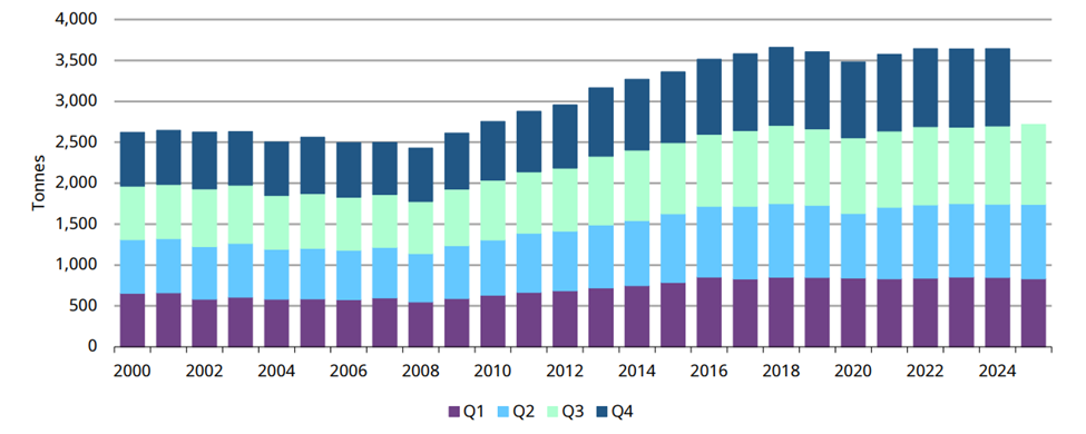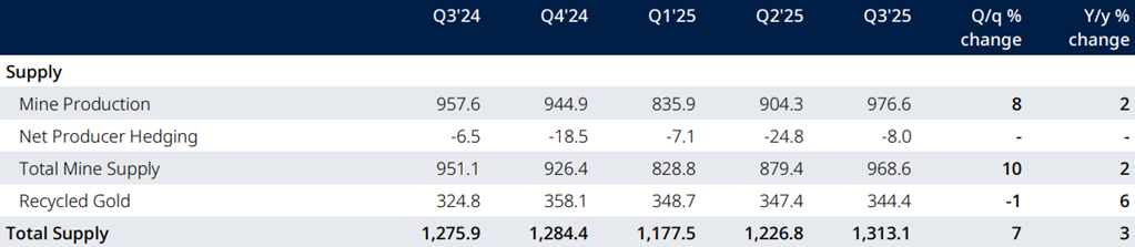 ستون فقرات عرضه طلا، یعنی تولید معدنی، در این فصل عملکردی قدرتمند اما محتاطانه داشته است. تولید خالص معادن به ۹۷۶.۶ تن رسید که حاکی از رشد ۲ درصدی نسبت به سال گذشته و جهش ۸ درصدی نسبت به بهار ۲۰۲۵ است. شورای جهانی طلا این افزایش را تا حدی به الگوهای فصلی نسبت میدهد که امری طبیعی در چرخههای استخراج است.