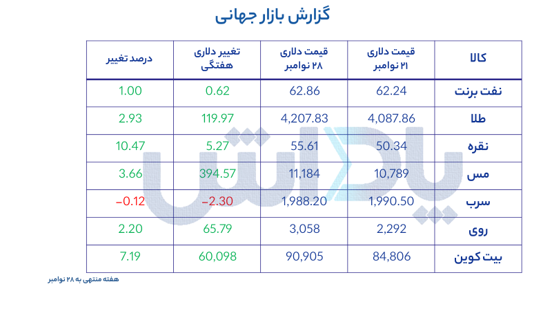 روند قیمت طلا در هفته منتهی به 28 نوامبر